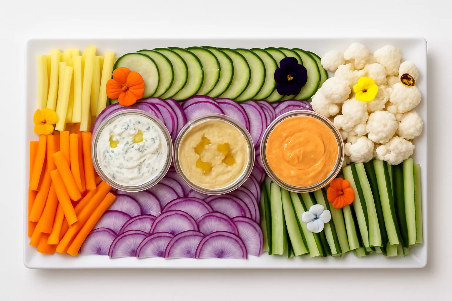 Crudités du moment + 3 sauces : tzatziki, houmous, crème poivron